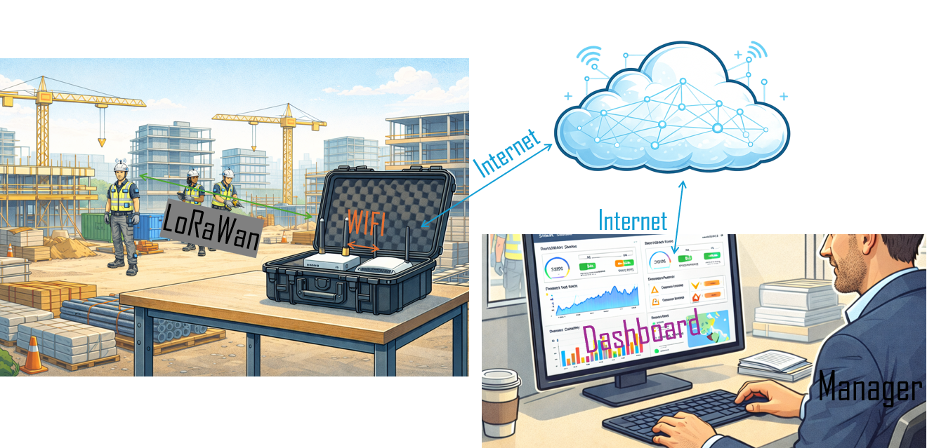 Vigilo è un sistema intelligente di monitoraggio per la sicurezza nei cantieri basato su tecnologia LoRaWAN®, progettato per garantire supervisione in tempo reale degli operatori e delle condizioni operative attraverso dispositivi wearable connessi. Il sistema integra caschi intelligenti, giubbotti ad alta visibilità dotati di tag smart e scarpe antinfortunistiche con moduli di comunicazione a basso consumo, in grado di trasmettere dati su lunghe distanze anche in ambienti complessi. I dispositivi comunicano tramite rete LoRaWAN® con un gateway installato in cantiere, che funge da nodo centrale di raccolta e inoltra le informazioni verso Internet tramite Ethernet, Wi-Fi o rete cellulare. I dati vengono quindi visualizzati su una dashboard web accessibile al responsabile di cantiere, consentendo il monitoraggio della presenza degli operatori, dello stato dei dispositivi, della qualità del segnale e la gestione di eventuali notifiche o alert. L’architettura è modulare, scalabile e adatta sia a contesti indoor sia outdoor, grazie all’utilizzo di gateway industriali a 8 canali in grado di supportare fino a migliaia di dispositivi con elevata affidabilità. La tecnologia LoRaWAN® permette comunicazioni a lungo raggio con bassi consumi energetici, risultando particolarmente adatta ad ambienti estesi come i cantieri edili. Vigilo rappresenta una soluzione innovativa per la digitalizzazione della sicurezza sul lavoro, migliorando il controllo operativo, la tracciabilità e la tempestività di intervento in caso di necessità, attraverso un’infrastruttura IoT robusta e facilmente implementabile.